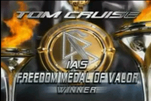 And it really is fun! Because, damn it, there is nothing better than the going out there and fighting a fight, and suddenly you see -- Pooofff -- things are better. I want to know that I've done everything I could every day. And I think about those people out there who are depending on us. And I think about that. And it does make me feel like, "Man, I've got to get others. We've got more work. I need more help. Get those spectators -- "You're in the playing field, or out of the arena." You know. And really, that's how I feel about it. I do what I can. And I do it the way I do everything. There's nothing part of the way for me. It's just "Poooohhh!" [Narrator] A Scientologist can be defined by a single question: "Would you want others to achieve the knowledge you now have?" In answering that question -- Tom Cruise has introduced LRH technology -- to over 1 billion people of earth. And that's only the first wave he's unleashed, which is why the story of Tom Cruise Scientologist has only just begun. TOM CRUISE FREEDOM MEDAL OF VALOR WINNER