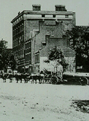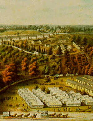 Figure 11. Located near the Seventh Street steamboat landing and the Washington and Alexandria Railroad station, Armory Square took the most severly injured—and suffered the highest death rate of any area facility. Courtesy of the National Library of Medicine. The hospitals encompassed all manner of public and private accommodations. The very first military hospital in Washington—located in two separate buildings on C Street between 3rd and 4 1/2 streets—was opened in February 1861 for Army Regulars. After the war's outbreak in April, Georgetown's Union Hotel and the City Infirmary on E Street were commandeered for the military's medical needs. Schools used as infirmaries included the Columbian and Georgetown Colleges, the Fifth Street Schoolhouse, and Miss Lydia English's Female Seminary, which still stands on the northeast corner of 30th and N streets, N.W. Mansion hospitals appeared on the country estates of former Washington Mayor Joseph Gales, Jr., at Eckington off North Capitol Street, and Dr. William J. Stone, on Meridian Hill near 14th Street. [12]