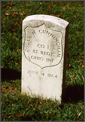 Figure 18. Whitman befriended Wisconsin Volunteers William Hugh McFarland (seated, center) and Stephen M. Dyer (standing, right), seen here posing with other soldiers for this medical record of "Amputees at Armory Square Hospital." Courtesy of the National Library of Medicine. Many soldiers Whitman befriended never went home. Such was the case for Oscar Cunningham, a young farmer from Delaware, Ohio, who was wounded on May 3, 1863, in the Battle of Chancellorsville. Upon seeing him at Armory Square in June, Whitman was immediately struck by the beauty of the tall and fair soldier: "Oscar H Cunningham bed 20 Ward K, Ohio boy, large, (told me he had usually weighed 200 lb) fracture of leg, above knee, rather bad—(a fine, magnificent specimen of western manliness)." Almost a full year after Oscar's arrival at Armory Square, Whitman noted that Oscar's "leg is in a horrible condition, all livid & swollen out of shape—the chances are against him poor fellow." On May 1, 1864, the doctors amputated Cunningham's right leg, and Whitman wrote on Oscar's behalf to his family, expressing new hope for Cunningham's recovery and telling them that it was unnecessary to make the long trip East. By June 3, however, Whitman told his own mother that the soldier he had visited for so long was near death: I have just left Oscar Cunningham, the Ohio boy—he is in a dying condition—there is no hope for him—it would draw tears from the hardest heart to look at him—his is all wasted away to a skeleton, & looks like some one fifty years old—you remember I told you a year ago, when he was first brought in, I thought him the noblest specimen of a young western man I had seen, a real giant in size, & always with a smile on his face—O what a change, he has long been very irritable, to every one but me, & his frame is all wasted away. Cunningham died on June 4, 1864, and was one of the first soldiers to be buried in the new Arlington National Cemetery. After Oscar's death, his sister Helen corresponded with Whitman. Although grateful to Oscar's hospital friend for his devoted service, Helen couldn't help reproaching Whitman for discounting the seriousness of Oscar's final illness and dissuading her from visiting. "I recd yours of the 2nd telling us of Oscars condition last Wednesday," she wrote. "I was going to start right of to see him I would have come long ago but he thought not, so did you. this time I intended to go whether anyone thought best or not but the same eve Liut Perry came bringing us the sad news of his death." [25]