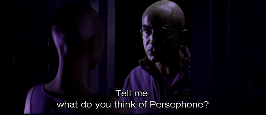[Charon] Tell me, what do you think of Persephone? [Elisa] Just like I imagined. [Charon] Meaning? [Elisa] She's been here too long. She lacks objectivity. [Charon] Yes, perhaps. Neurinos no longer trusts her?