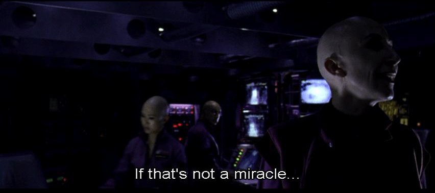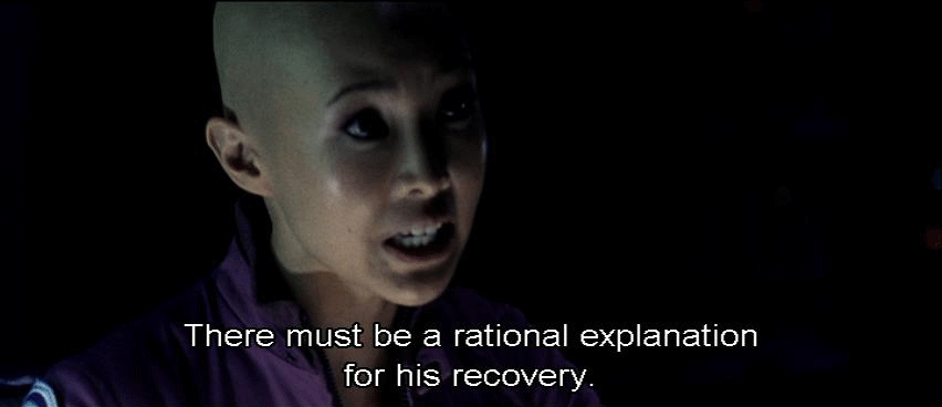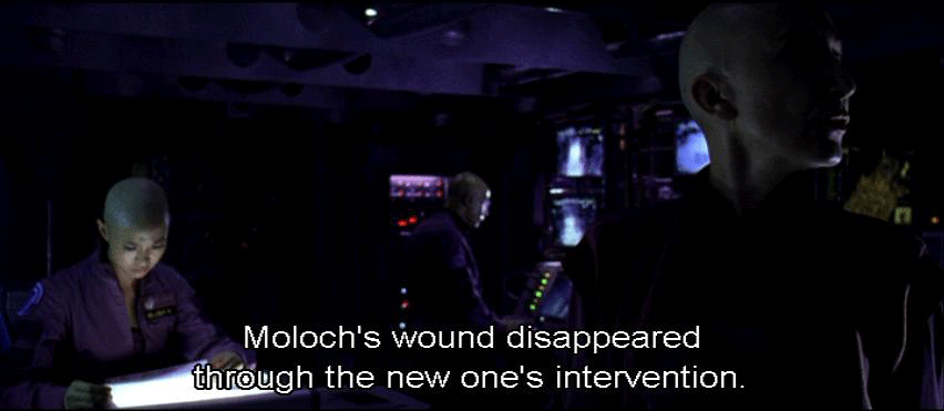 [Persephone] He was in his death throes. Now look at his heartbeat. If that's not a miracle ... [Elisa] Ridiculous. It was just a superficial wound. [Persephone] Moloch's wound disappeared through the new one's intervention. [Elisa] There must be a rational explanation for his recovery.