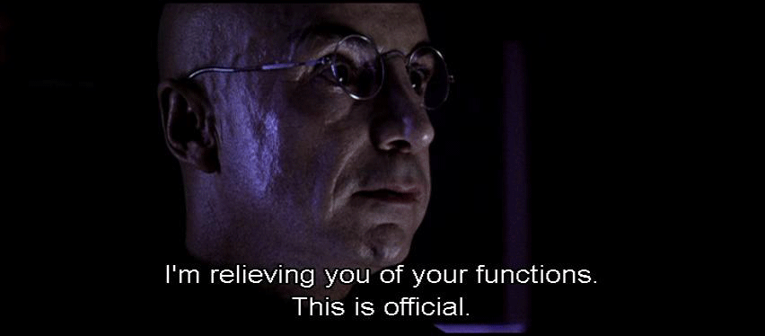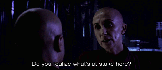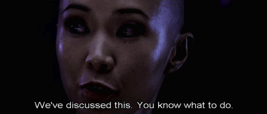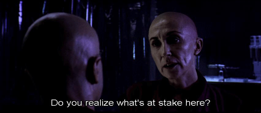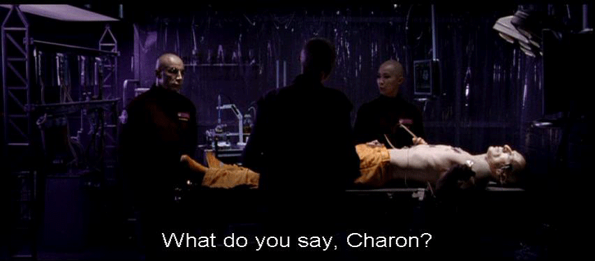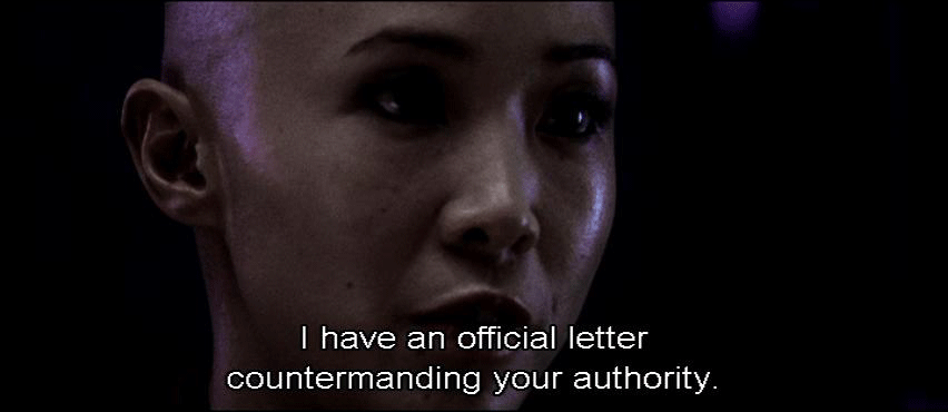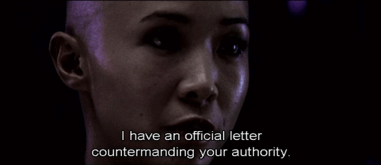 [Elisa] I have an official letter countermanding your authority. [Persephone] Stuff your letter. [Elisa] What do you say, Charon? We've discussed this. You know what to do. [Charon] I'm relieving you of your functions. This is official. [Persephone] Do you realize what's at stake here? Not just you or me. All of humanity.