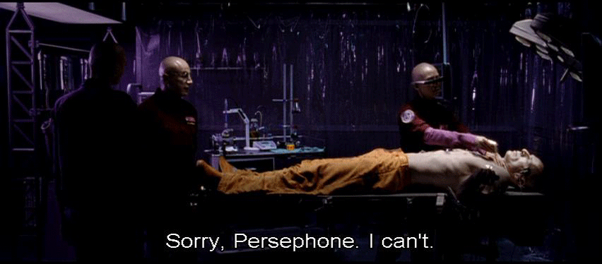 [Charon] Oh, humanity. [Persephone] They'll commercialize his genetic codes and then eliminate him. We must keep him alive, understand what he is. We have to stop her changing his metabolism. Charon. [Charon] Sorry, Persephone. I can't. Neurinos has given her authority over you. They'll leave when the shuttle's ready.