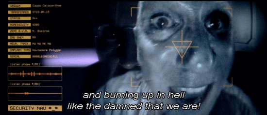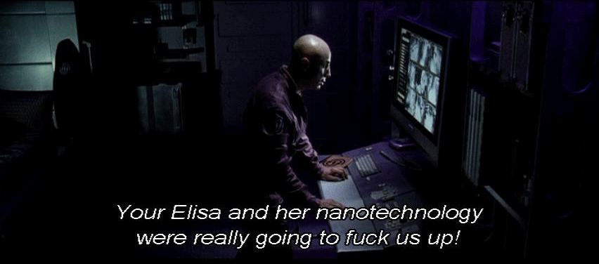 and burning up in hell like the damned that we are! [Charon] That's nonsense. [Attila] I know what you're playing at, Charon. I cracked your files a long time ago. Your Elisa and her nanotechnology were really going to fuck us up! We were all going to be contaminated from the inside. Infected like a common computer program. You know what to do with epidemics? Burn everything.
