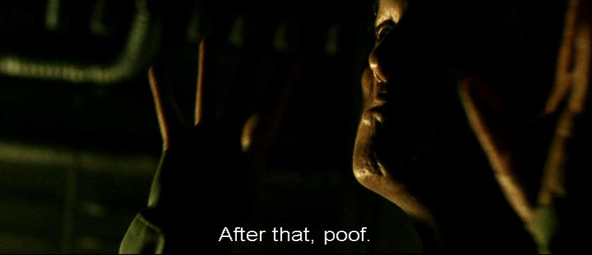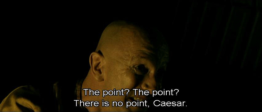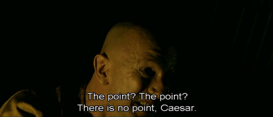 [Attila] I got it off the chief up there to snoop in company files. He thought he controlled me. [Cesar] Get to the point! [Attila] The point? The point? There is no point, Caesar. We've less than an hour to live. After that, poof. Poof. Ha ha ha!
