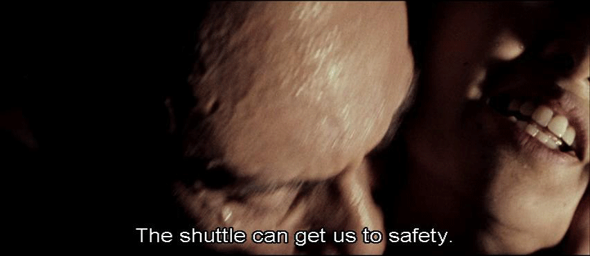 [Elisa] You're not -- [Lazarus] No, I'm not asleep. I can hold my breath. [Elisa] You're hurting me. [Lazarus] You can't give me orders now. Where were you going? [Elisa] The shuttle can get us to safety.