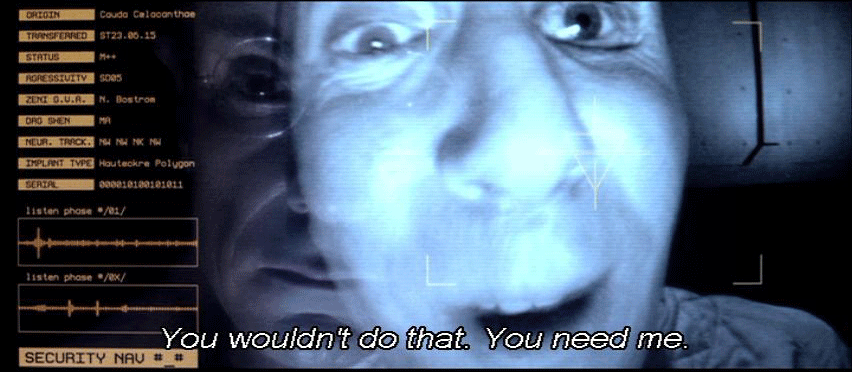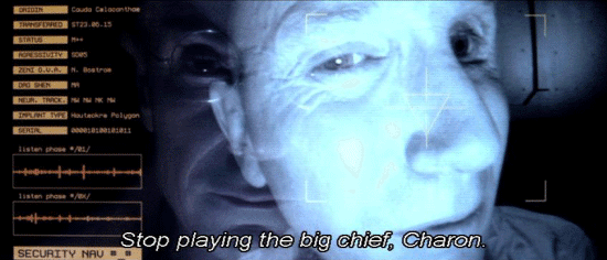 [Attila] I'm working on it, sweetie. Keep your hair on. [Charon] That will do. Remember, you're only a prisoner. [Attila] Stop playing the big chief, Charon. [Charon] I could withdraw your account to the network. [Attila] You wouldn't do that. You need me. And if they found out up there,