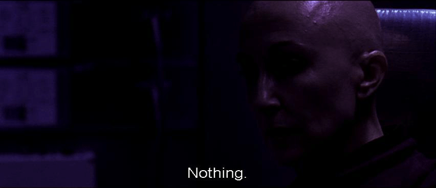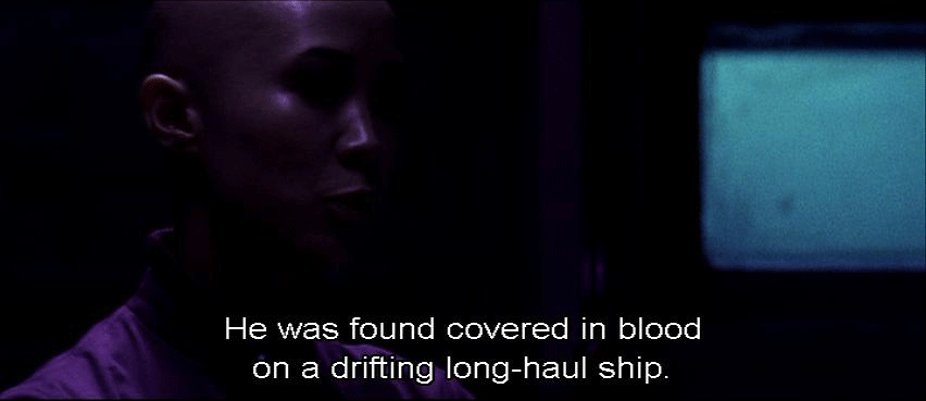 Answer me! [Persephone] We don't know very much about your shuttle companion. [Elisa] He was found covered in blood on a drifting long-haul ship. Alone on board. {Persephone] Any ID? [Elisa] Nothing.