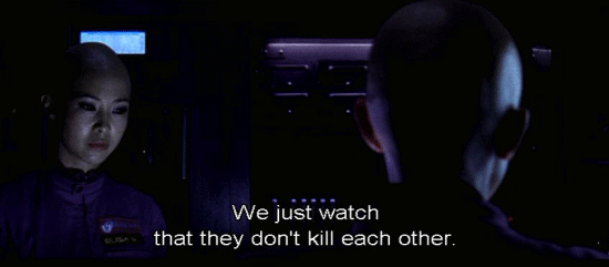 We just watch that they don't kill each other. Sometimes we intervene too late, unfortunately. [Elisa] Maybe if you applied the protocols more strictly. [Persephone] There's more to life than protocols.