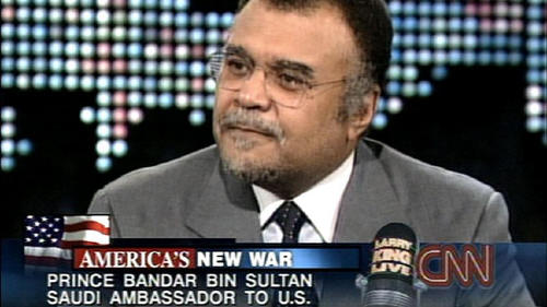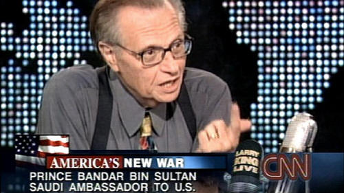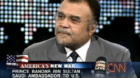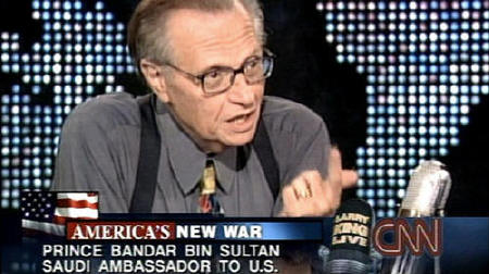 [Larry King] He came to thank you for helping bring America to help him. And now he may be responsible for bombing America. [Prince Bandar] Absolutely. [Larry King] What did you make of him when you met him? [Prince Bandar] I was not impressed too much, to be honest with you. [Larry King] Not impressed? [Prince Bandar] No. I thought he was a simple and very quiet guy. [Moore] Hmm. A simple and quiet guy, whose family just happened to have a business relationship with the family of George W. Bush. Is that what he was thinking about? Because if the public knew this, it wouldn't look very good. Was he thinking, "You know, I need a big, black marker"?