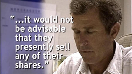 [George Bush] [August 1992] When you're the president's son and you've got unlimited access combined with some credentials from a prior campaign, in Washington, D.C., people tend to respect that. I mean, access is power. And I can find my dad and talk to him any time of the day. [Moore] Yes, it helps to be the president's son, especially when you're being investigated by the Securities and Exchange Commission. [TV News] In 1990, when Mr. Bush was a director of Harken Energy, he received this memo from company lawyers warning directors not to sell stock if they had unfavorable information about the company.