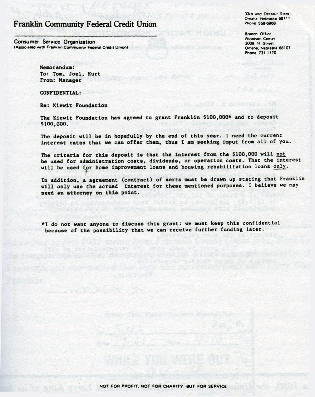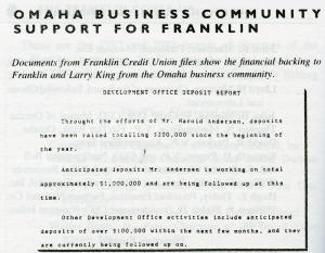 Edd H. Bailey, Pres. (ret.), Union Pacific Railroad 1990 addition Howard G. Buffett In 1981, Warren E. Buffett was on the board of the Omaha National Corporation, which merged with First National Bank of Lincoln in 1984, to become FirsTier. An undated report from Franklin's Development Office cited Harold Andersen's fundraising for the credit union. A letter to Larry King from V./ J. Skutt, then chairman and CEO of Mutual of Omaha, referred to lobbying for Franklin by Harold "Andy" Andersen. Larry King wrote this memo to his staff about funds forthcoming from the Kiewit Foundation, associated with the Peter Kiewit and Sons construction firm. In 1980, the Union Pacific Foundation informed Larry King of its latest grant. A handwritten note at the top instructs a Franklin employee to expedite the transaction. According to this 1981 memo from Franklin Credit Union files, Boys Town, the famous orphanage,. planned to deposit $1 million with Franklin. Boys Town officials maintained that they had no connections with Larry King or Franklin. Memorandum of a phone call to Joel Rogers, Franklin staffer and a homosexual lover of King, from a Boys Town official.