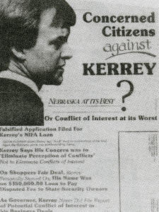 PHOTOS Lawrence E. ("Larry") King, manager of the Franklin Community Federal Credit Union. The former headquarters of the Franklin Credit Union, in north Omaha. The rear of the Franklin Building. Credit union employees reported that King had a bedroom built into the lower level, for afternoon trysts with homosexual lovers. Larry King's house at 2071 Wirt Street, the address that abuse victim Loretta Smith gave Officer Carmean in 1988, as a location of drug and sex parties. Alisha Owen on her way to a court appearance. Paul Bonacci in prison. Governor Bob Kerrey of Nebraska, now a U.S. Senator and presidential candidate, signing a bill in 1986. Directly behind Kerrey is state Senator John DeCamp, then head of the Legislature's Banking, Commerce, and Insurance committee. A broadside issued in 1988 by Concerned Citizens for Responsible Government, Inc., which investigated Kerrey's role in the collapse of Commonwealth Savings and his preferential treatment of State Security and other institutions owned by his associates. The governor's 1983 press conference about commonwealth's difficulties triggered the run on the bank. Senator Loran Schmit, chairman of the Nebraska Legislature's Franklin committee. A farmer and a 23-year veteran of the Legislature, Senator Schmit persisted in the Franklin investigation, despite vilification of him in the press, death threats, and attempts to ruin him financially. Senator Ernie Chambers, who co-initiated the legislative probe of the Franklin scandal. The late Gary Caradori, investigator for the Legislature's Franklin committee, with his airplane. He and his eight-year-old son, A.J., died when it crashed on July 11, 1990. "There were a lot of people who wanted to see Gary dead," said Senator Schmit that day.