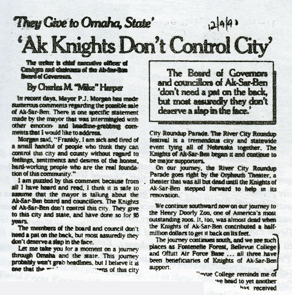 December 9, 1990 World Herald article, the Ak-Sar-Ben Board of Governors