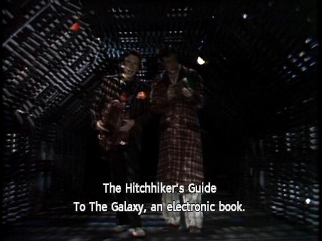 [Ford] The Hitchhiker's Guide to the Galaxy, an electronic book. [Ford] It'll tell you everything. [Arthur] I like the cover. "Don't panic"! [Arthur] First helpful thing anyone's said! [Ford] That's why it sells so well. Shh! |