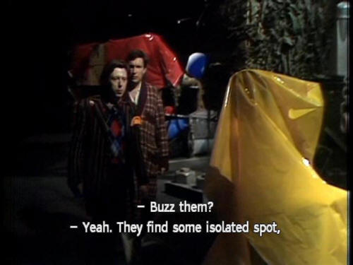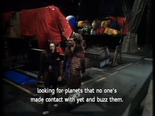 [Ford] Rich kids with nothing to do. [Ford] They cruise around the Galaxy [Ford] looking for planets that no one's made contact with yet and buzz them. [Arthur] Buzz them? [Ford] Yeah. They find some isolated spot, |