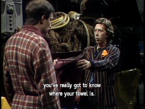 [Ford] All sorts of people trying to kill you, rip you off, everything ... [Ford] If you're going to survive out there, [Ford] You've really got to know where your towel is. [Ford] Now, fish. |