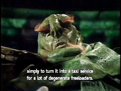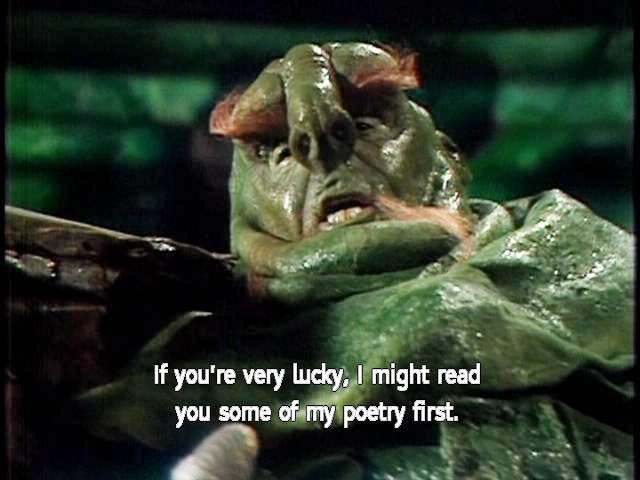 [Vogon Captain] simply to turn it into a taxi service for a lot of degenerate freeloaders. [I have sent out a search party [Vogon Captain] and, as soon as they find you, I shall turn you off the ship. [Vogon Captain] If you're very lucky, I might read you some of my poetry first. |