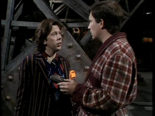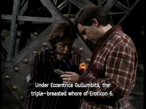 [Ford] Under Eccentrica Gallumbits, the triple-breasted whore of Eroticon 6. [Arthur] Oh, yes. What does it say? [Arthur] "Harmless." One word? Harmless? [Ford] Well, it's the old edition. |