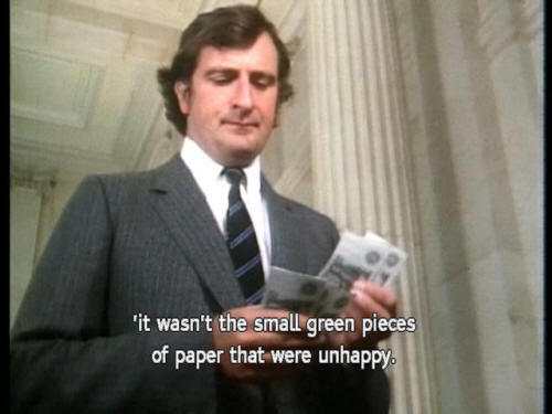 'Many solutions were suggested for this problem, 'mostly concerned with the movements of small green pieces of paper, 'which is odd, because, on the whole, 'it wasn't the small green pieces of paper that were unhappy. |