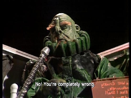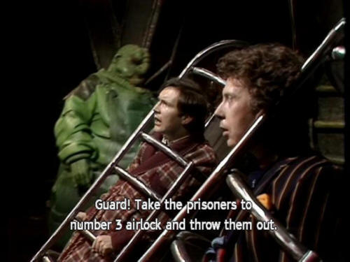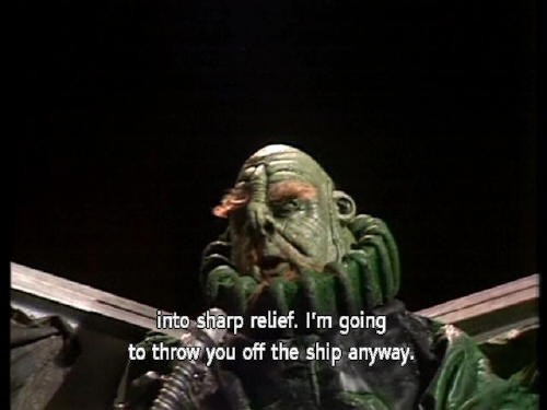 [Vogon Captain] No! You're completely wrong. [Vogon Captain] I write poetry just to throw my mean, callous, heartless exterior into sharp relief. I'm going to throw you off the ship anyway. Guard! Take the prisoners to number 3 airlock and throw them out. |