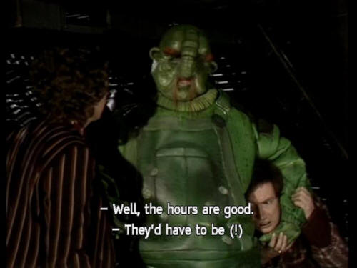 [Ford] Yeah, stomping around, shouting, pushing people off spaceships. [Vogon Guard] Well, the hours are good. [Ford] They'd have to be (!) [Arthur] Ford, what are you doing? [Ford] Shh! |