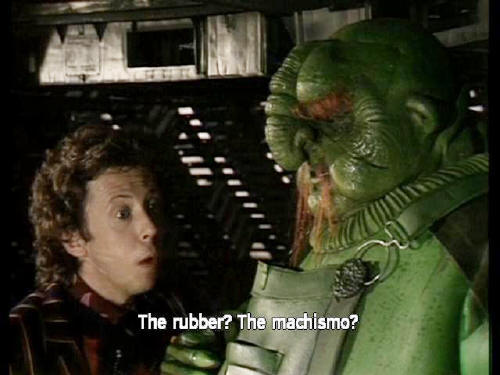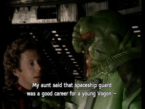 [Ford] The rubber? The machismo? [Vogon Guard] I don't know, really. I think I just sort of ... do it. [Vogon Guard] My aunt said that spaceship guard was a good career for a young Vogon -- [Ford] you know, the uniform, the low-slung stun-ray holster, mindless tedium ... |