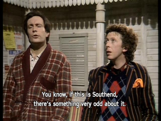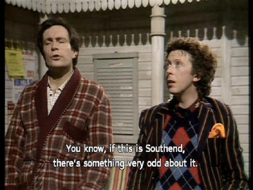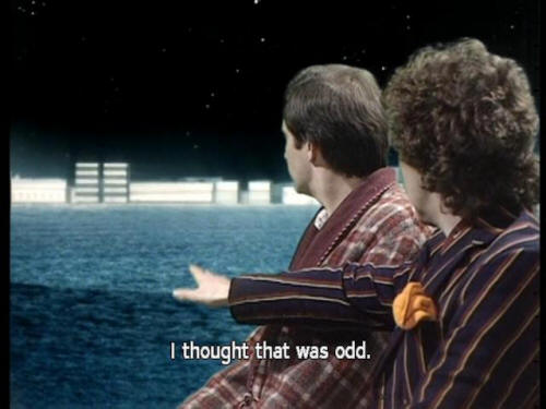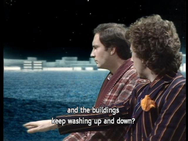 [Ford] Sea ... [Arthur] You know, if this is Southend, there's something very odd about it. [Ford] You mean the way the sea stays steady as a rock ... [Ford] and the buildings keep washing up and down? [Ford] I thought that was odd. |