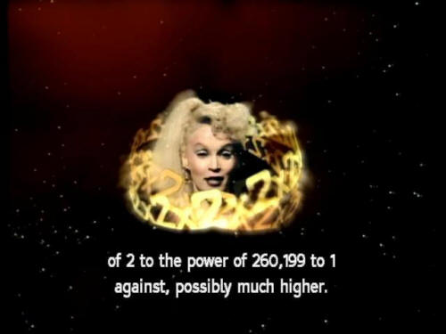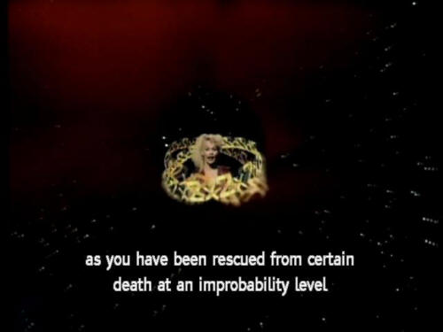 [Trillian] Please do not be alarmed by anything you see or hear around you. [Trillian] You are bound to feel some initial ill effects [Trillian] as you have been rescued from certain death at an improbability level [Trillian] of 2 to the power of 260,199 to 1 against, possibly much higher. |