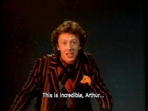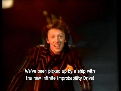 [Ford] We've been picked up by a ship with the new Infinite Improbability Drive! [Ford] This is incredible, Arthur ... [Ford] (WHOOPING) Arthur? What's happening? |