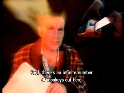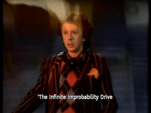 [Arthur] Ford, there's an infinite number of monkeys out here [Arthur] who want to talk to us about this script for Hamlet they've worked out. 'The Infinite Improbability Drive 'is a wonderful new method of crossing interstellar distances |