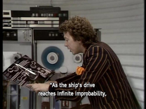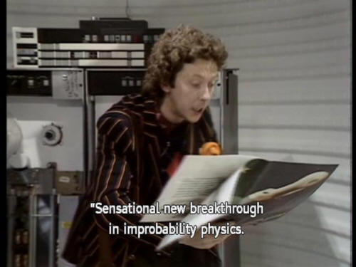 [Ford] Ah, this is what I was after! [Ford] "Sensational new breakthrough in improbability physics. [Ford] "As the ship's drive reaches Infinite Improbability, "it passes through every point in the Universe. |