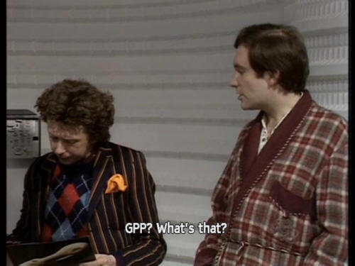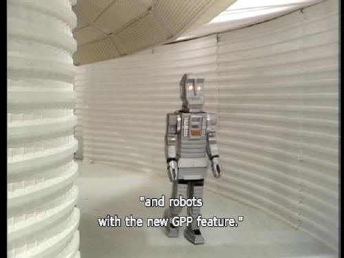 [Ford] They make a big thing of the ship's cybernetics. [Ford] "A new generation of Sirius Cybernetics Corporation computers [Ford] "and robots with the new GPP feature." [Arthur] GPP? What's that? |