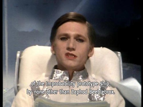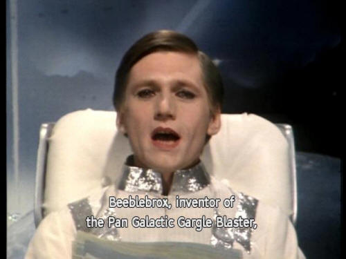 [Reporter] of the Improbability prototype ship, by none other than Zaphod Beeblebrox, [Reporter] And the question everyone's asking --- [Reporter] has the big Zee finally flipped? [Reporter] Beeblebrox, inventor of the Pan Galactic Gargle Blaster, |