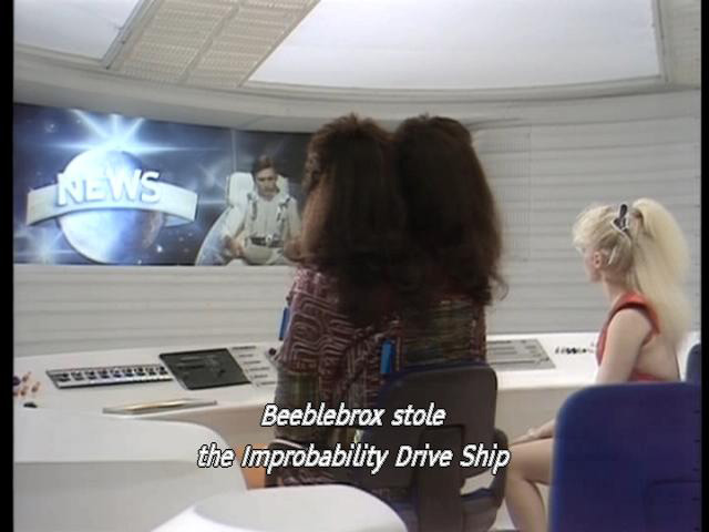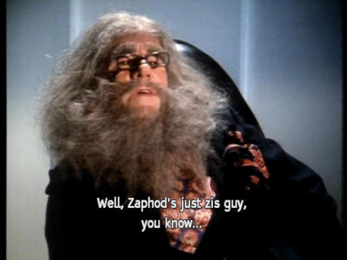 [Reporter] Has he got an answer? We asked his brain care specialist Gag Halfrunt. [Specialist] Well, Zaphod's just zis guy, you know ... [Reporter] Beeblebrox stole the Improbability Drive Ship [Reporter] when he was meant to be launching it ... |