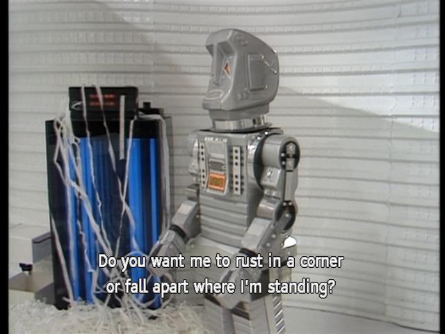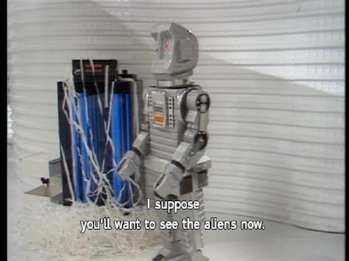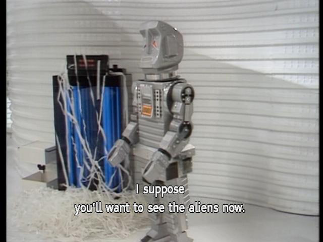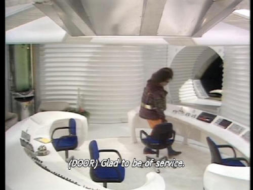 [Door] Glad to be of service. [Marvin] I suppose you'll want to see the aliens now. [Marvin] Do you want me to rust in a corner or fall apart where I'm standing? [Zaphod] Show them in. |