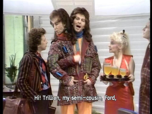 [Zaphod] Oh, God! Ford, this is Trillian. [Zaphod] Hi! Trillian, my semi-cousin, Ford, [Zaphod] who shares three of the same mothers as me. [Zaphod] Is this sort of thing going to happen every time we use the Drive? [Trillian] Very probably, I'm afraid. |