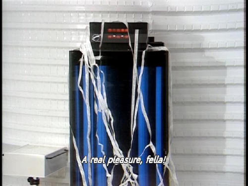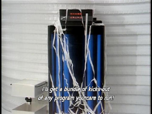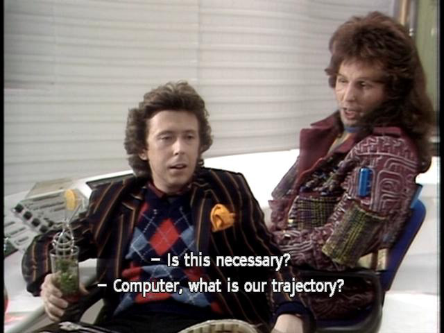 [Computer] I'll get a bundle of kicks out of any program you care to run! [Ford] Is this necessary? [Zaphod] Computer, what is our trajectory? [Computer] A real pleasure, fella! [Computer] We are currently in orbit at an altitude of 300 miles |