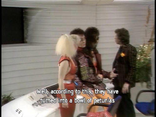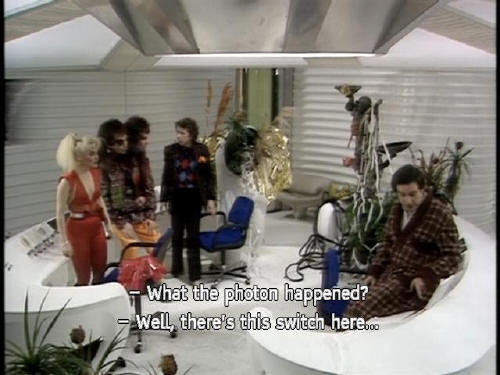[Zaphod] What the photon happened? [Arthur] Well, there's this switch here ... [Zaphod] Where are we? [Trillian] Exactly where were were, I think. [Zaphod] What about the missiles? [Ford] Well, according to this, they have turned into a bowl of petunias |