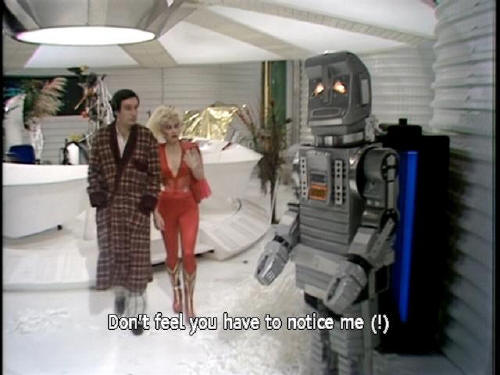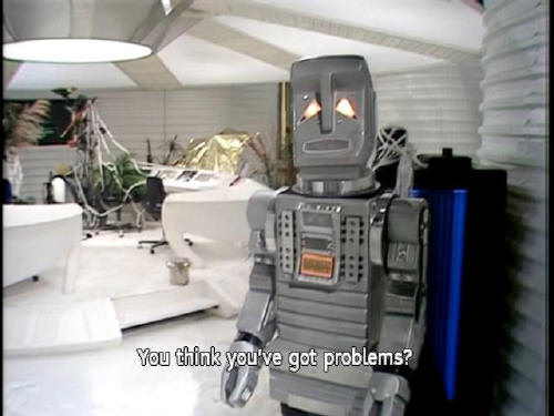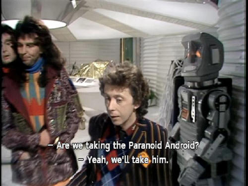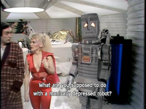 [Ford] Are we taking the Paranoid Android? [Zaphod] Yeah, we'll take him. [Marvin] Don't feel you have to notice me (!) [Trillian] What are you supposed to do with a manically depressed robot? [Marvin] You think you've got problems? |