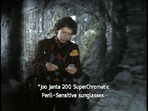 [Ford] "Joo janta 200 SuperChromatic Peril-Sensitive sunglasses. [Ford] "To help you develop a relaxed attitude to danger. [Ford] "At the first hint of trouble, they turn black |