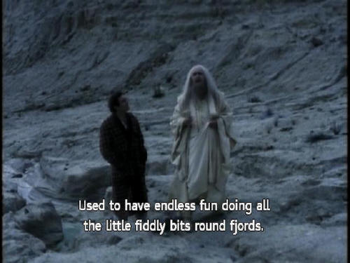 [Slartibartfast] Used to have endless fun doing all the little fiddly bits round fjords. [Slartibartfast] Well, anyway, the recession came, [Slartibartfast] and we thought it would save a lot of bother if we just slept through it. [Slartibartfast] So we programmed the computers to revive us when it was all over. |