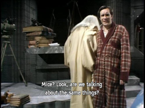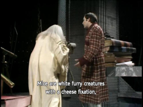[Slartibartfast] we discovered they'd been dead for 30,000 years. [Slartibartfast] Who's going to clear away the bodies? That's what no one has an answer for. [Arthur] Mice? Look, are we talking about the same things? [Arthur] Mice are white furry creatures with a cheese fixation, [Arthur] women standing screaming on tables in early '60s sitcoms. [Slartibartfast] Earthman, it is sometimes hard to follow your mode of speech. |
