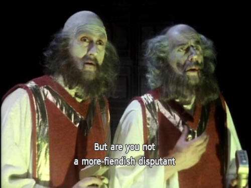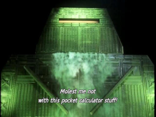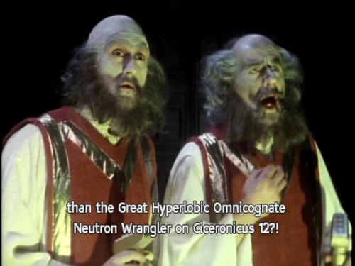 [Priest 1] in the 7th Galaxy of Light and Ingenuity? [Computer] The Googleplex Star Thinker? [Computer] Molest me not with this pocket calculator stuff! [Priest 2] But are you not a more fiendish disputant [Priest 2] than the Great Hyperlobic Omnicognate Neutron Wrangler on Ciceronicus 12?! |