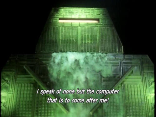 [Computer] The Great Omnicognate Neutron Wrangler [Computer] could talk all four legs off an Arcturan megadonkey, [Computer] but only I could persuade it to go for a walk afterwards! [Priest 2] Then ... what is the problem? [Computer There is no problem! [Computer] I speak of none but the computer that is to come after me! |