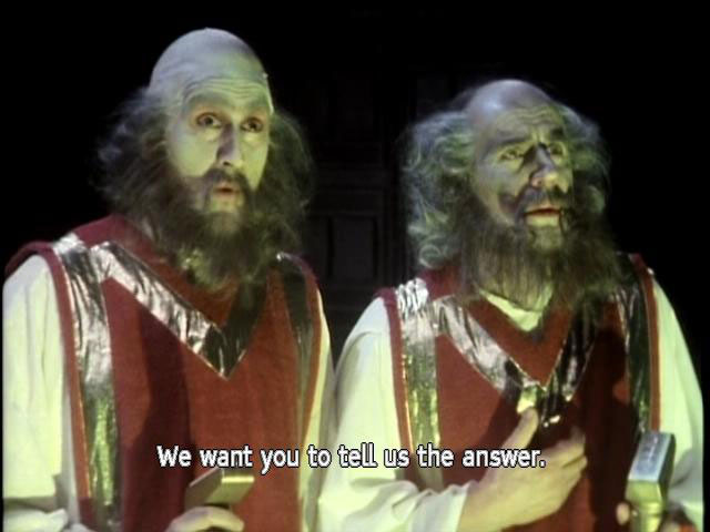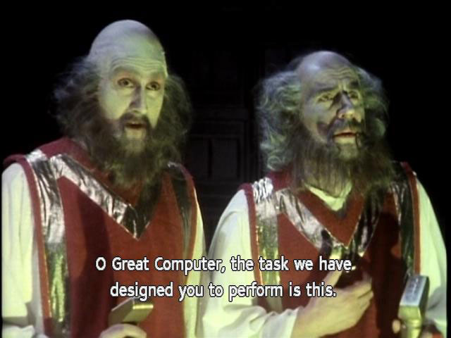[Priest 1] O Great Computer, the task we have designed you to perform is this. [Priest 1] We want you to tel us the answer. [Computer] The answer? [Computer] The answer to what? [Priest 1] Life! [Priest 2] The Universe! [Priest 1] Everything! [Computer] Tricky. |