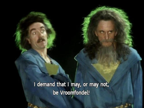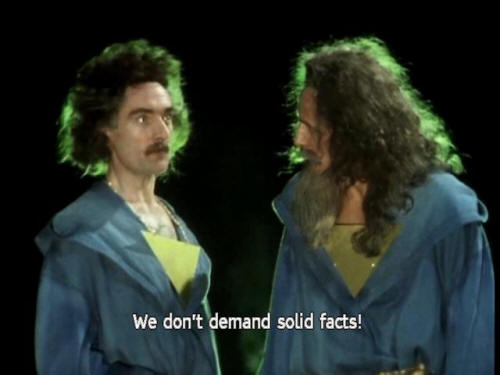 [Vroomfondel] What we demand is solid facts! [Majikthise] No, we don't. That is precisely what we DON'T demand! [Vroomfondel] We don't demand solid facts! [Vroomfondel] What we demand is a total absence of solid facts! [Vroomfondel] I demand that I may, or may not, be Vroomfondel! |