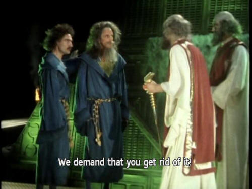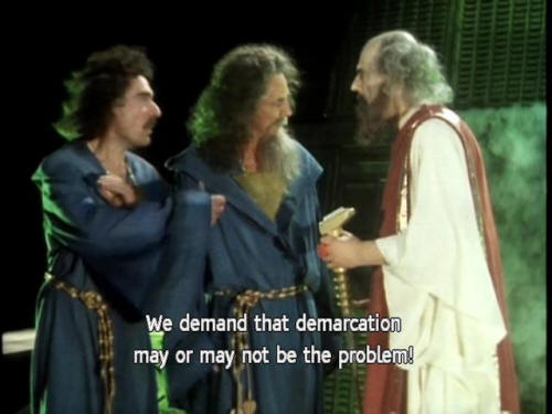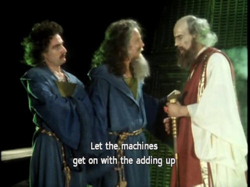 [Vroomfondel] We demand that you get rid of it! [Priest 2] What's the problem? [Majikthise] The problem is demarcation, mate! [Vroomfondel] We demand that demarcation may or may not be the problem! [Majikthise] Let the machines get on with the adding up [Majikthise] and WE'LL take care of the eternal verities! [Majikthise] By law, the quest for ultimate truth |