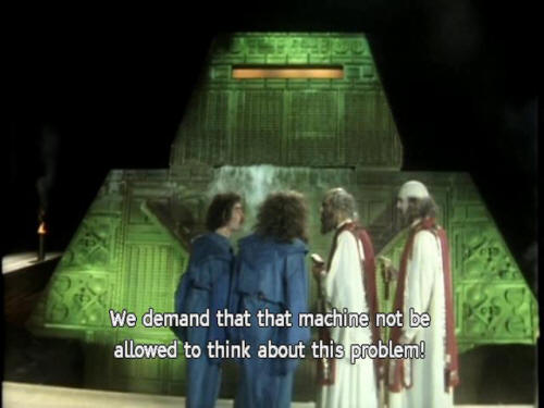 [Vroomfondel] We demand rigidly defined areas of doubt and uncertainty! [Computer] Might I make an observation at this point? [Majikthise] Keep out of this! [Vroomfondel] We demand that that machine not be allowed to think about this problem! (THUNDERCLAP) |