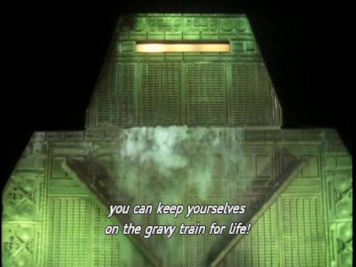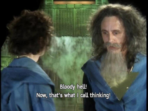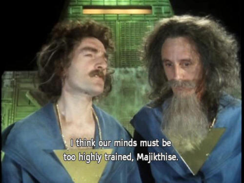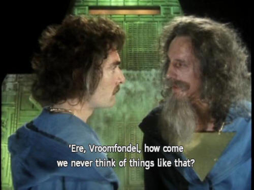 [Computer] you can keep yourselves on the gravy train for life! [Majikthise] Bloody hell! Now, that's what I call thinking! [Majikthise] 'Ere, Vroomfondel, how come we never think of things like that? [Vroomfondel] Dunno [Vroomfondel] I think our minds must be too highly trained, Majikthise. |